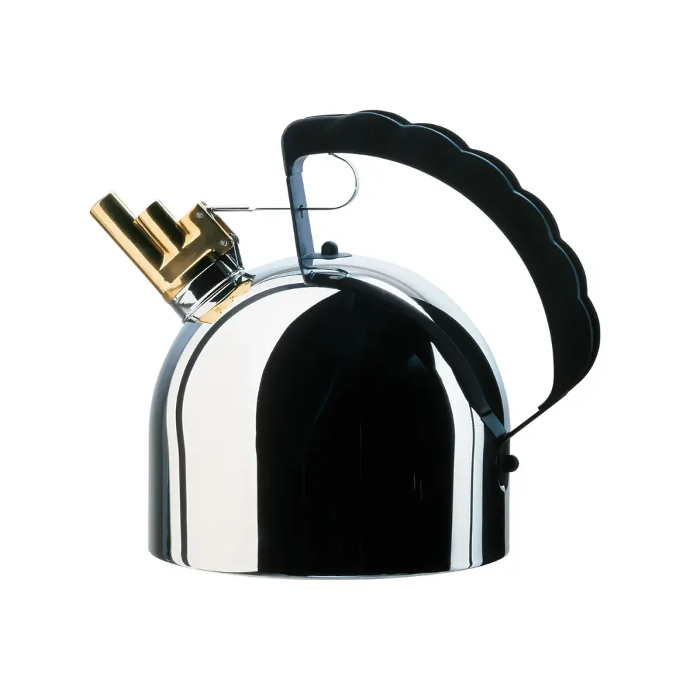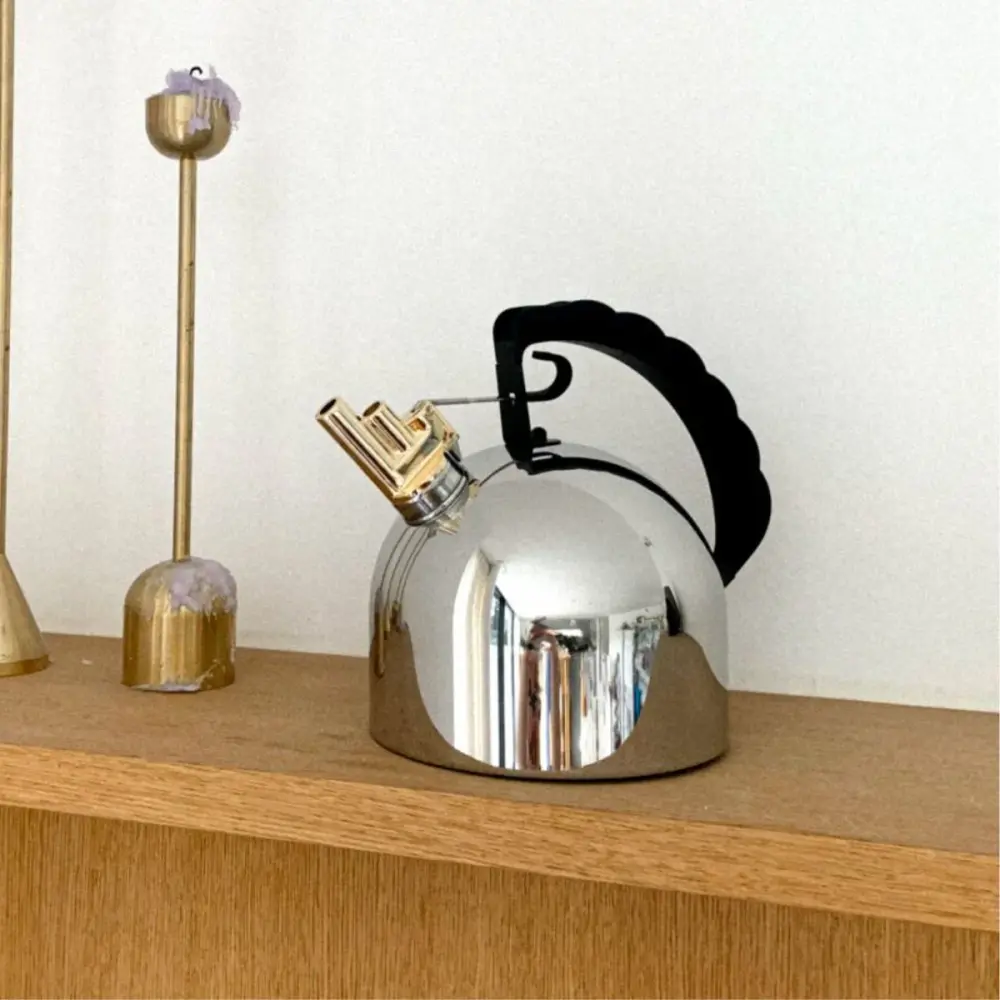 This Richard Sapper stainless acero kettle by Alessi will surprise you far more than you expect. Do you know how it alerts you when the water starts to boil? With a harmonic whistle melody that recalls the sound of ship sirens on the Rhine. Amazing, right?