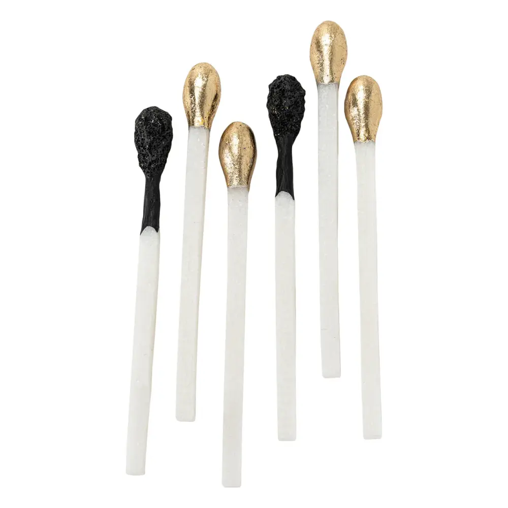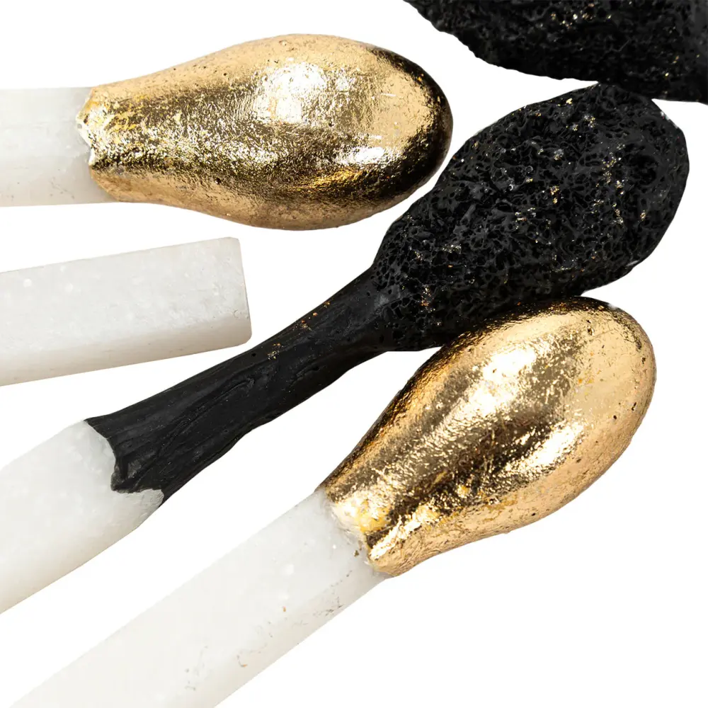 Moderno set de 6 cerillos dorados y negros. Resina y polvo de cuarzo. 20cm de elevado cada uno.