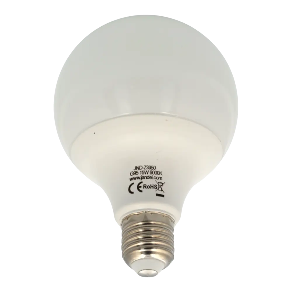 Bombilla led g95 con conector e27 de 15w color de luz blanco frío 6000k. bombilla con rosca e27, que es la rosca mas utilizada en bombillas. Esta rosca se adapta en los casquillos de bombillas mas utilizados del mercado, muy habituales en los casquillos colgantes de escalera, taller, garaje, obra, nave, etc…bombilla e27 de 15w que emiten una cantidad de luz parecida a las clásicas de 100w.El ahorro energético es del 75% con una reducción en el consumo significativa, y con los beneficios inherentes de para nuestra cartera y el medio ambientelos 15w de la bombilla generan 1950 lúmenes reales, jandei testa sus productos con sus equipos y evita las exageraciones de rendimiento de otros fabricantes.la luz blanca fría es la mas blanca de los tonos habituales, es el tono de 6000k.Esta luz ofrece una sensación de iluminación fuerte y además tiene un muy buen contraste, lo que facilita el trabajo con objetos pequeños, lectura de planos, etc..Perfecta par iluminación de pasillos, salas de trabajo