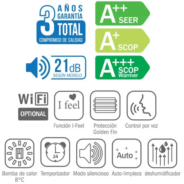 Con una certificación A++ en modo frío y A+ en calefacción, podrás gozarlo ahorrando energía con tu aire acondicionado y bomba de calor sin preocuparte por el consumo de la factura de la luz.