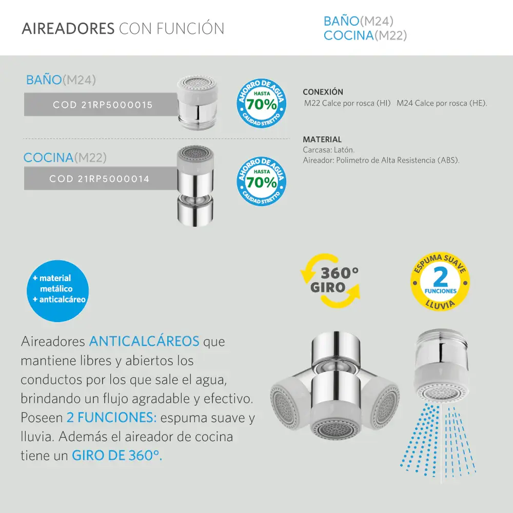 Aireador anticalcáreo que brinda un flujo simpático y efectivo. Posee 2 funciones y giro en 360°.