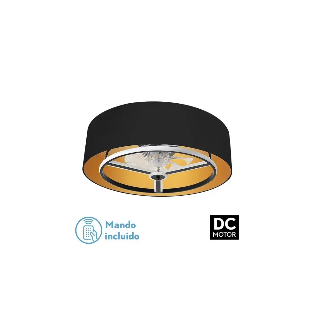 Ventilador DC serie ANUSKA con pantalla NEGRO/ORO y ventilador NEGRO de la serie BORA. Realizado en metal, policarbonato y textil.De diseño exclusivo, moderno y muy decorativo, se hace el centro de la habitación que ilumina/ventila.Con 8 aspas transparentes integradas en su estructura y 6 velocidades ajustables. Posee TECNOLOGÍA LED INTEGRADA con 60 watios de potencia, 5100 lúmenes y 3 temperaturas de luz, cálida, natural y luz blanco frío (3000ºk-4000ºk-6000ºk).Sus dimensiones son de 20x70x70 centímetros. Dispone de MANDO A DISTANCIA, CON MEMORIA DE COLOR, REGULADOR DE INTENSIDAD y TEMPORIZADOR 1/2/4/8 H.Modelo también disponible en color blanco/oro, negro/oro y negro/oro-oro. En esta serie hay una gran variedad de artículos a juego para terminar acorde con las necesidades que necesite, como son el pie de salón, aplique, colgantes de 30,40 y 50 centímetros de diámetro, dos medidas de sobremesas, los plafones y los ventiladores. Número de aspas: 8Número de velocidades ajustables: 6Control