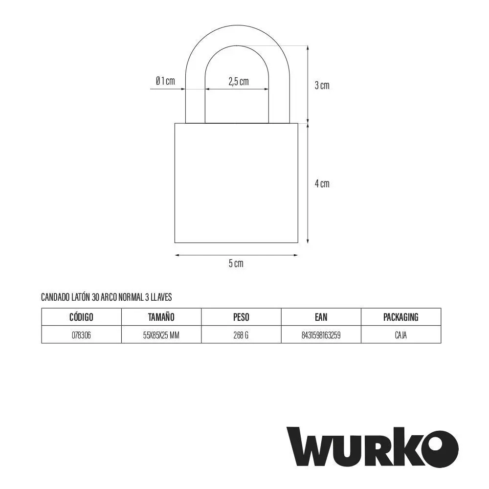 Candado de laton de 30 mm, arco normalincluye 3 llavespresentación en cajita.Especificaciones