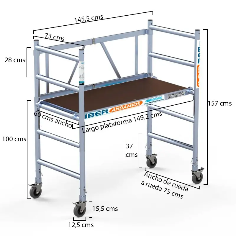 El andamio plegable con ruedas COMPACTO módulo 1 es un andamio especialmente indicado para instaladores de cartón yeso, escayolistas y oficios similares. Es versátil y cómodo, especialmente diseñado para interiores, con una plataforma de 150 cm. Es compacto e ideal para espacios reducidos.Este andamio plegable con ruedas tiene unas dimensiones de 75×150 cm y una altura de trabajo de hasta 3 metros, aunque ampliable hasta 7,5 metros. Es sencillo de acoplar, estando listo para utilizar en solo 1 minuto.Este andamio plegable con ruedas es muy ligero y manejable, está fabricado con tubo de aluminio de 50 mm de diámetro y un espesor de 2 mm de pared. La plataforma fabricada también en aluminio y madera contrachapada. Es hidrófuga y antideslizante con una carga máxima de 200 kg/m2.El andamio plegable con ruedas está compuesto por:1 Unidad plegable de 5 pasos de 75×150 cm1 plataforma 150 antideslizante SIN TRAMPILLA (Medidas 60×150 cms)4 ruedas de 125 mm de diámetro con frenos4 clips de retenc