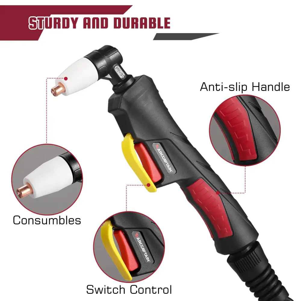 1. Cortador de antorcha de plasma PT31 de alto rendimiento : alta frecuencia de 30 amperios con cable de 13 pies, presión de aire de 4,5 a 5,5 bar, flujo de aire de 150 l/min, ciclo de trabajo del 60 %.