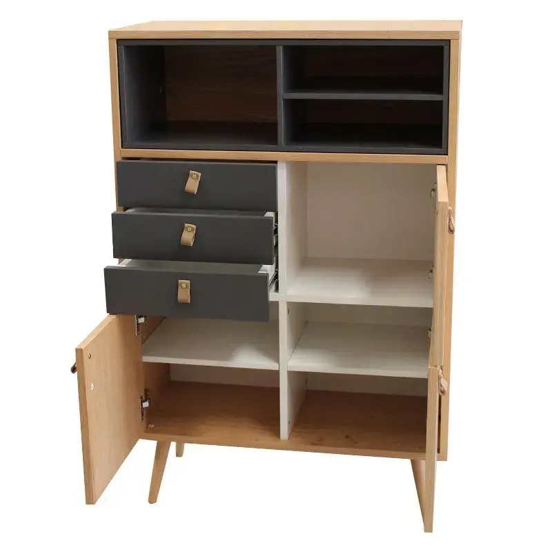 El aparador modelo Bergi es ideal para expandir el espacio de almacenaje de cualquier estancia de tu hogar dándole un aire muy exclusivo gracias a su diseño. Viene con 3 armarios, 3 cajones y 3 huecos en los que podrás preparar todo tipo de objetos y exhibir tu decoración favorita. Los tiradores son de polipiel en color marrón y sus patas son elevadas, lo que hace que el mueble esté separado del suelo facilitando la limpieza bajo él. Está fabricado en madera de alta calidad con acabado en color original con unos toques en tono grafito que le da mucha personalidad.