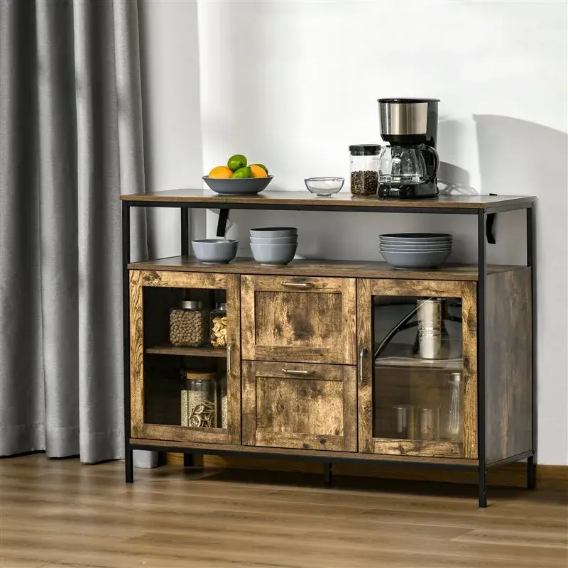 El aparador estilo industrial de la marca Homcom es ideal para obtener un extra de almacenamiento y organización en tu cocina o comedor. Está fabricado en melamina de madera con estructura de acero, lo que lo hace muy resistente para un uso prolongado. Cuenta con una amplia encimera, 2 cajones, 1 balda y 2 armarios cerrados con estante de altura regulable. Además, su bonito diseño le dará un toque original y innovador a la estancia donde lo coloques. Cuenta con dispositivo antivuelco para mayor seguridad y estabilidad.