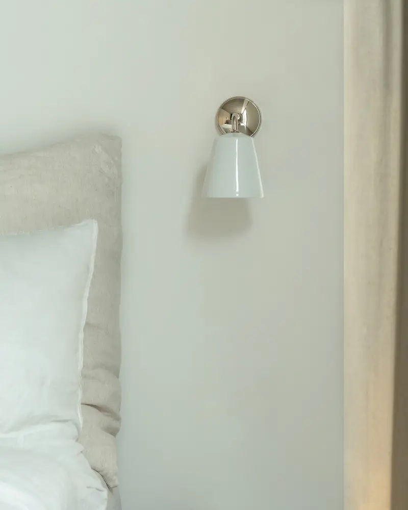 Aplique de pared Richmond pequeño con porcelana – Níquel pulido ✔ Diseño plano que ahorra espacio en la pared ✔ Materiales resistentes a la humedad interior 🛒 Consigue una iluminación ambiental perfecta