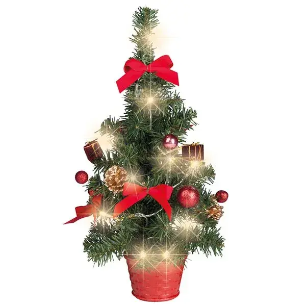 Árbol decorativo de Navidad Material: plástico Luces LED: 20 Con adornos navideños: bolas, piñas, paquetes de regalo y lazos Base redondeada color rojo Apto para interior y exterior Resistente al uso Certificado CE Altura: 45 cm
