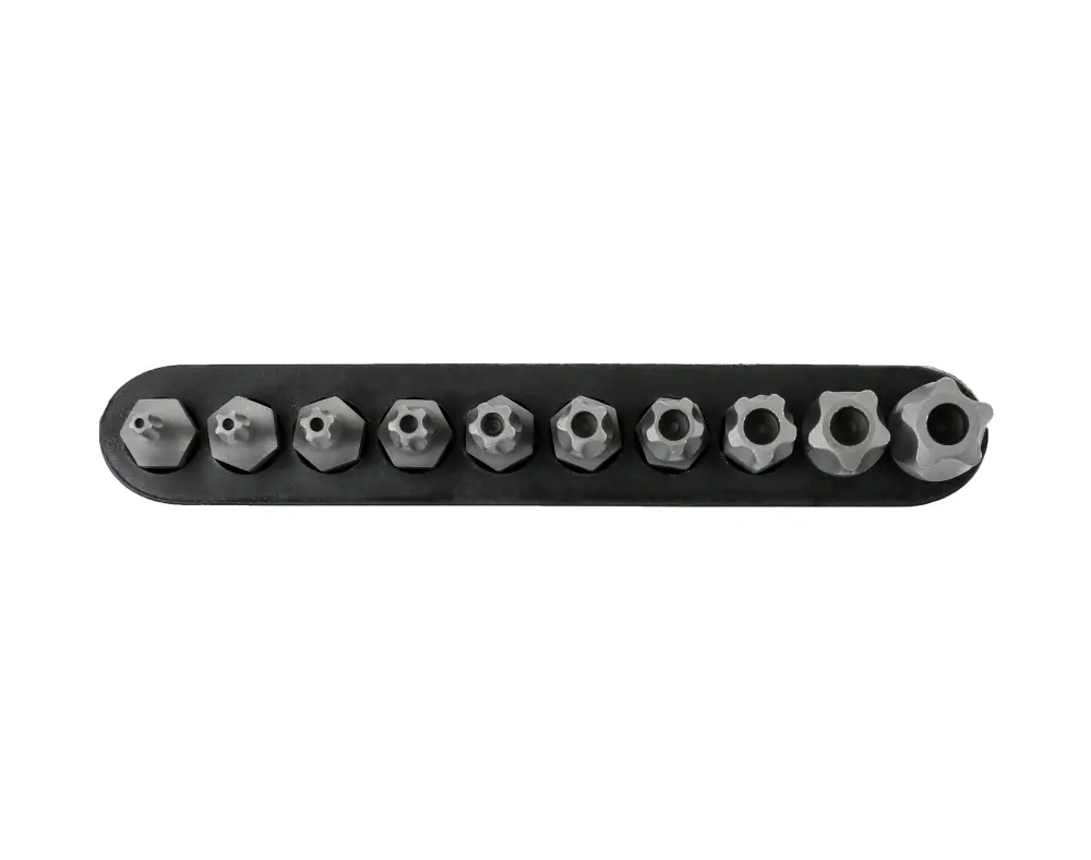 - El juego incorpora: 10 puntas Torx de 5 puntas a prueba de manipulaciones y 1 riel de almacenamiento.