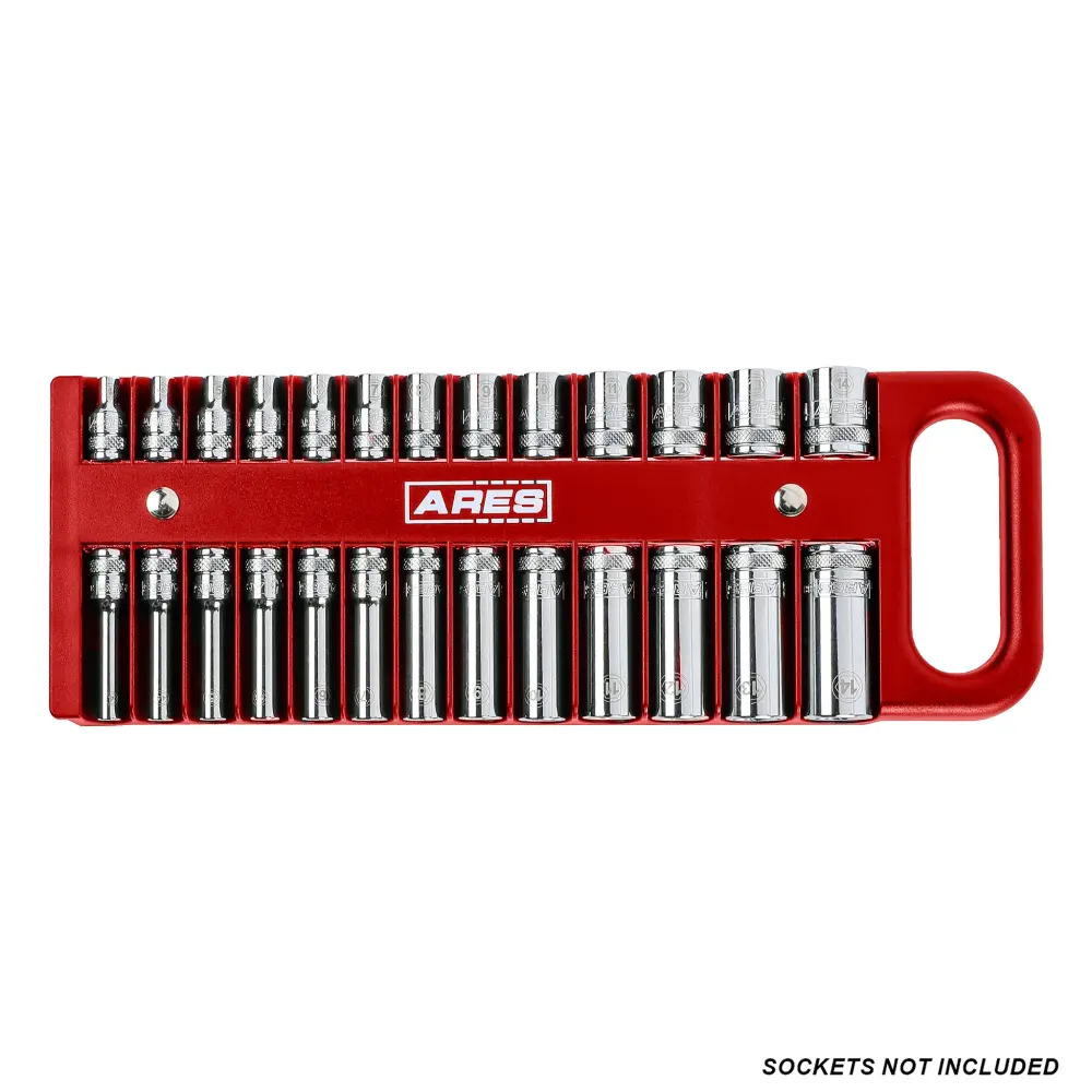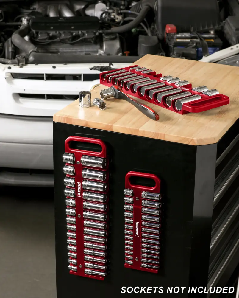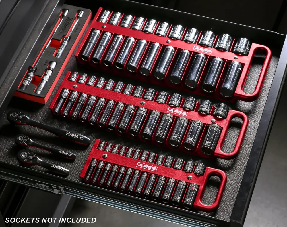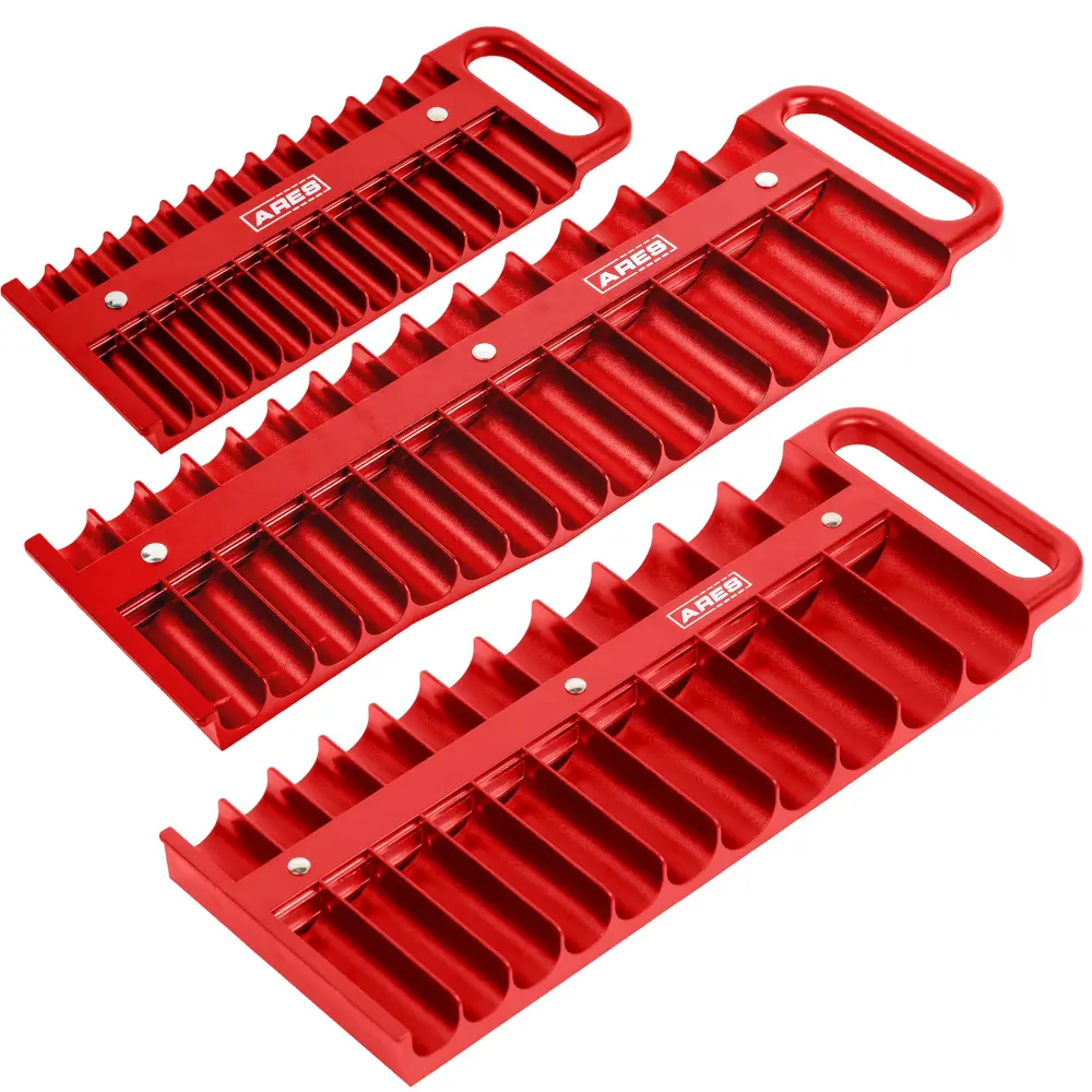 El juego de 3 portavasos rojos ARES tiene espacio para 38 vasos poco profundos y 38 profundos, de modo que puede almacenar y organizar todos sus favoritos, tanto SAE como métricos, en un lugar conveniente. Este portavasos cuenta con imanes potentes para conservar sus vasos firmemente en su lugar, por lo que nunca tendrá que buscarlos en su caja de herramientas, e incluso hay espacio para tamaños de vasos de hasta 1 – 3/16 pulgadas o 30 mm. Gracias al asa, puede llevar sus vasos a cualquier lugar de manera rápida y sencilla.