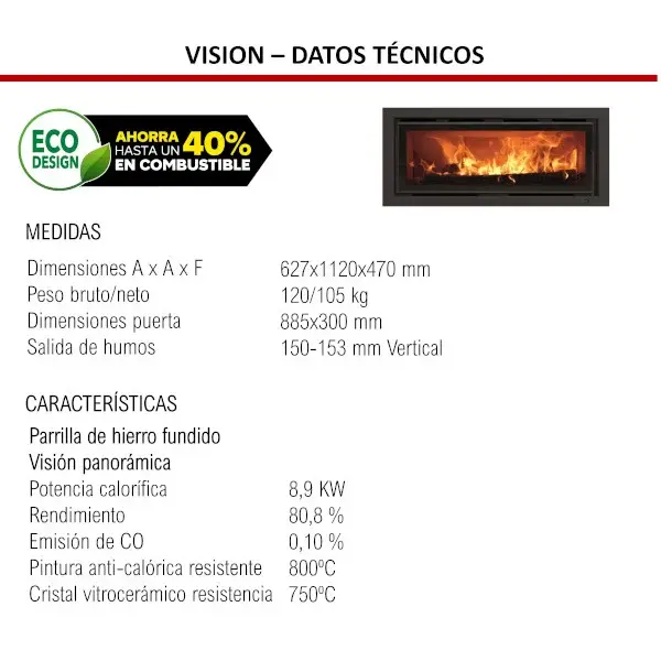 Triple combustión: más rendimiento, menos residuos.Sistema cristal limpio: impide que éste se ennegrezca de forma rápida y que tenga una mayor visión del fuego.Especificaciones