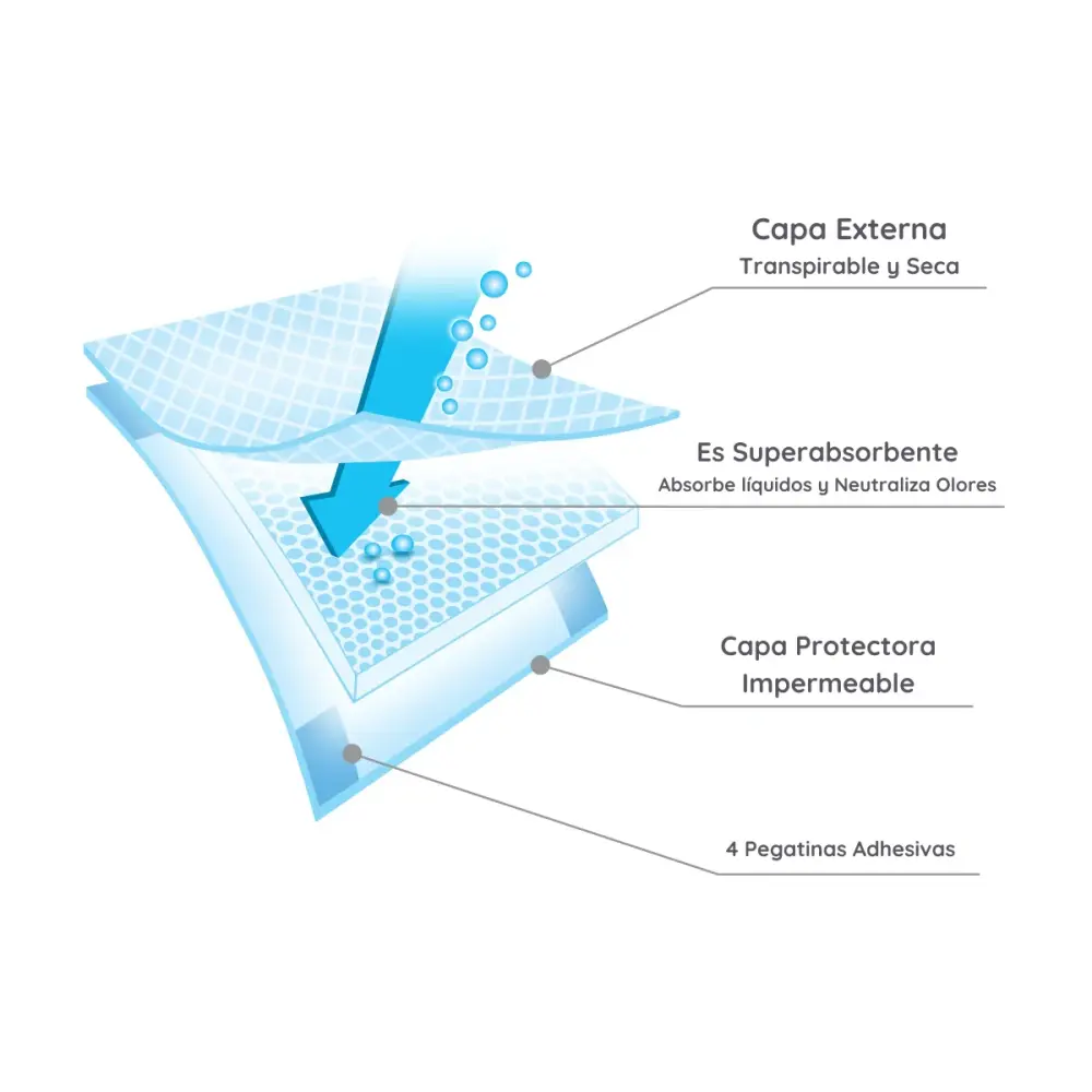 La capa exterior de plástico protege contra manchas, mientras que las tiras adhesivas previenen el deslizamiento. El super absorbente en su interior absorbe rápidamente la humedad y neutraliza los olores desagradables, garantizando una superficie siempre seca y fresca. Su diseño sutil y ligero hace que sean fáciles de llevar y desechar después de su uso.