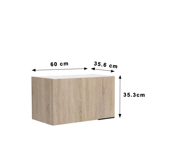 Módulo alto de colgar fino FUMAY de 60 cm con 1 puerta. Módulo para colgar de almacenamiento de 1 puerta. Fabricado en panel de partículas revestido de foil roble. Tirador acabado aluminio negro. L.60 H 57,9 P 35,6. Ideal para aquellos a los que les gusta tener una cocina adaptada a sus necesidades con un bonito diseño y al mejor precio. ¡No esperes mas!. Elige