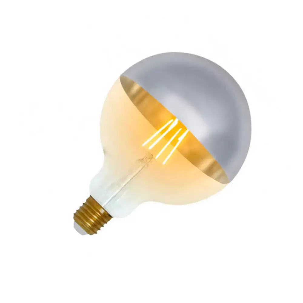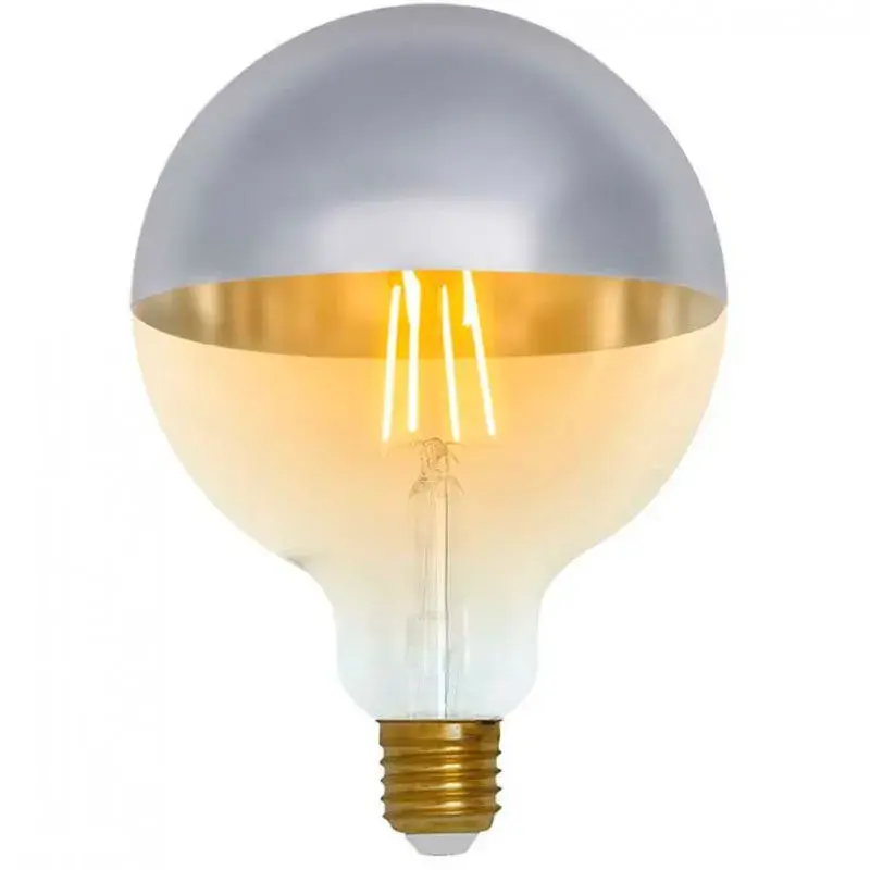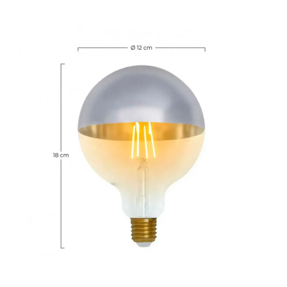 ¿Te gustaría alterarla iluminación de tu sala de estar o dormitorio? Esta bombilla LED globo modeloG120 de 7hSevenOn puede ser una gran elección. Fabricada en cristal con cúpula enacabado plata, tiene un estilo vintage muy chulo. Cuenta con una potencia de 8Wy desprende una bonita luz blanca muy bueno, con temperatura de color de2100K con el que fabricará un ambiente cálido y agradable. Su amplio difusordispersa la luz de manera homogénea, cuenta con 806 lúmenes de flujo luminoso yhasta 15.000 horas de vida útil. Funciona con tecnología LED de filamento. Graciasa su protección IP20 estará protegida del polvo. Además, es eficienteenergéticamente, permitiéndote ahorrar luz gracias a su certificaciónenergética de clase A+.
