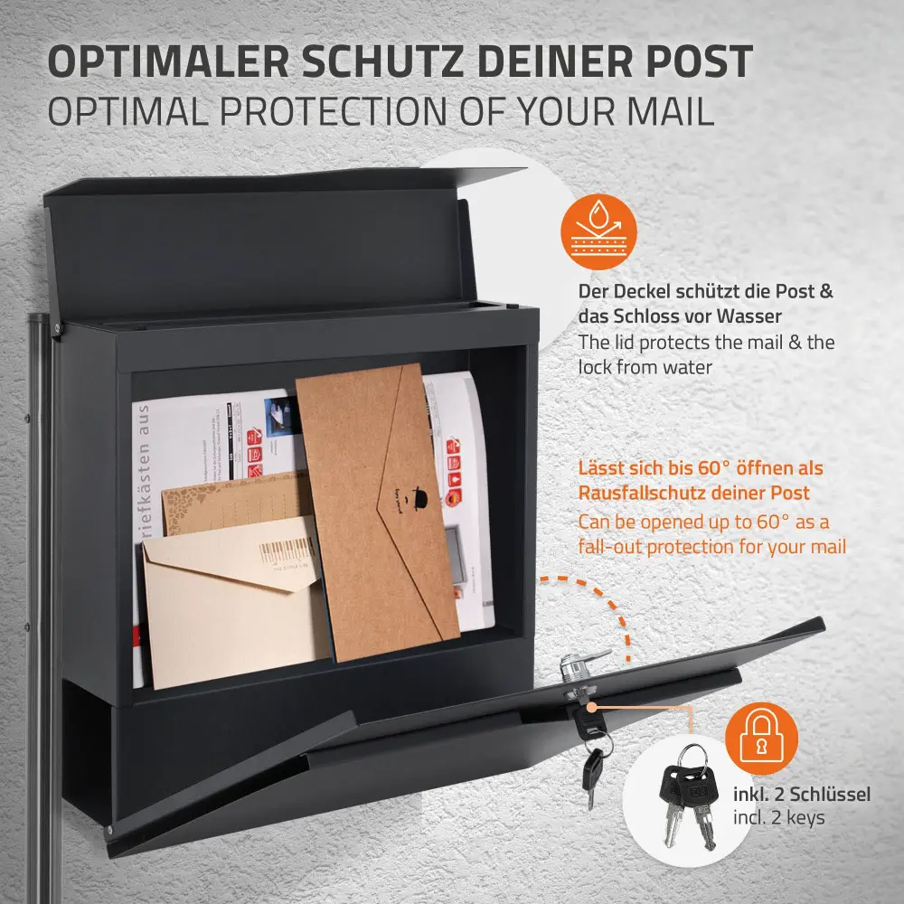 De acero inoxidable con recubrimiento en polvo – Este recubrimiento de alta calidad es especialmente duradero y sencillo de lavar. El buzón, así como la ranura de inserción, están fabricados de tal forma que incluso los sobres grandes pueden caber dentro sin arrugarse ni dañarse. La cerradura y las llaves suministradas mantienen su correo bien cerrado.