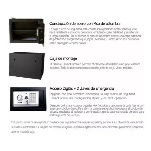 La Caja Fuerte Digital Logan en color negro es una solución ideal para la protección de tus objetos de valor. Con dimensiones de 23x17x17 cm, esta caja potente está construida con acero sólido resistente, lo que garantiza confiabilidad y durabilidad a lo largo del tiempo.