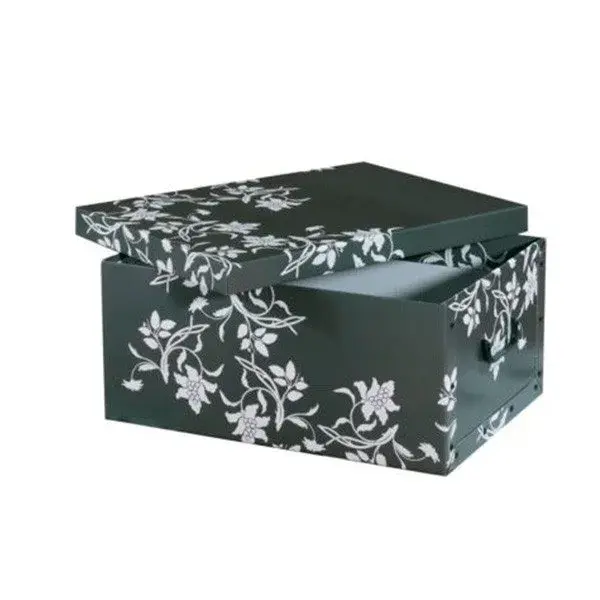 Es de cartón resistente, tiene fondo negro con motivos de flores en blanco. El estampado es ideal para que puedas dejar la caja a la vista y que sea un elemento decorativo más. También tiene asas para una sujeción muy sencilla.
