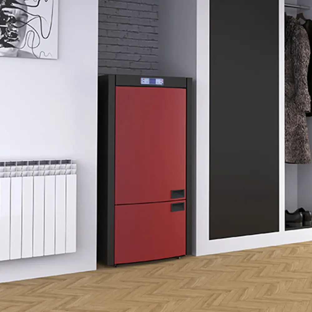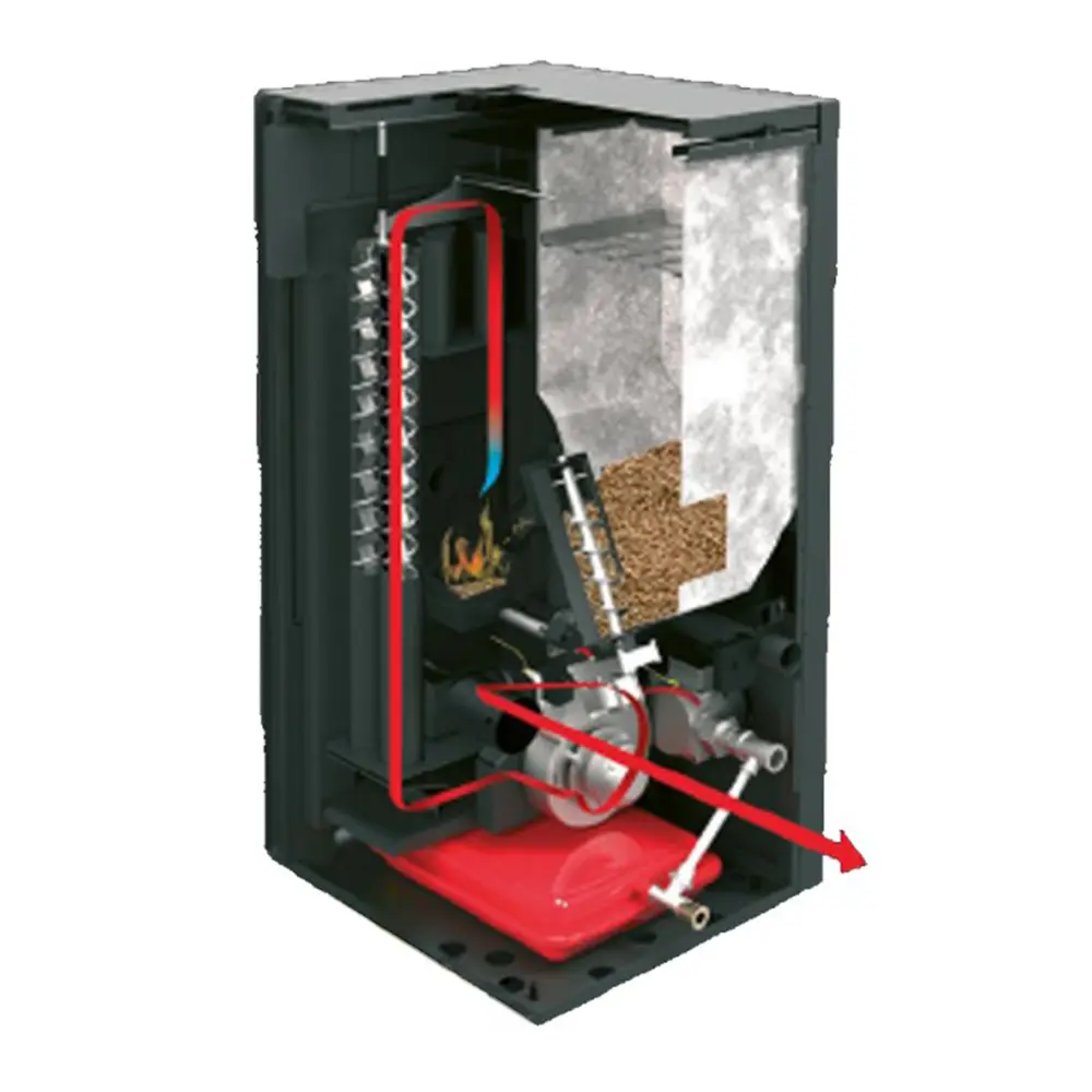 está equipada con un controlador por microprocesador, así como con un quemador de pellets integrado, una tolva de combustible para pellets de madera, una bomba de circulación para la calefacción central y el depósito de expansión.