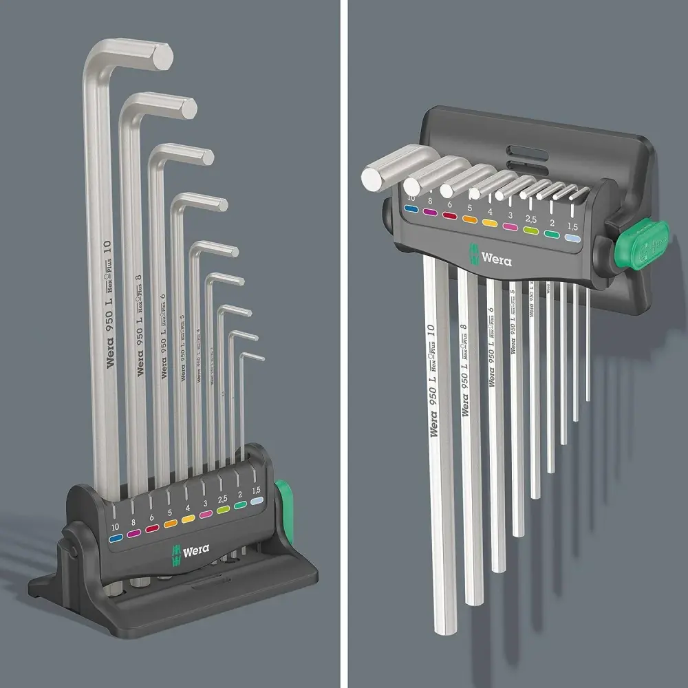 Una ventaja especial es el cómodo almacenamiento en un estante que se puede colocar en posición vertical sobre la mesa o colgar en la pared. Además de eso, el bastidor incluye un magnetizador extraíble inteligente que se puede utilizar para magnetizar (y desmagnetizar) tornillos y puntas de herramientas; Ya no tendrás que luchar para sujetar el tornillo con la segunda mano.