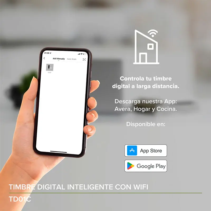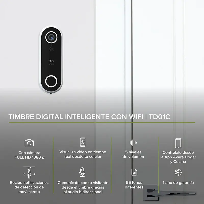 ¡Ding, dong! Nuestro timbre electrónico inteligente está aquí. Con él monitorea lo que sucede fuera de tu hogar a través de la App Avera Hogar y Cocina.