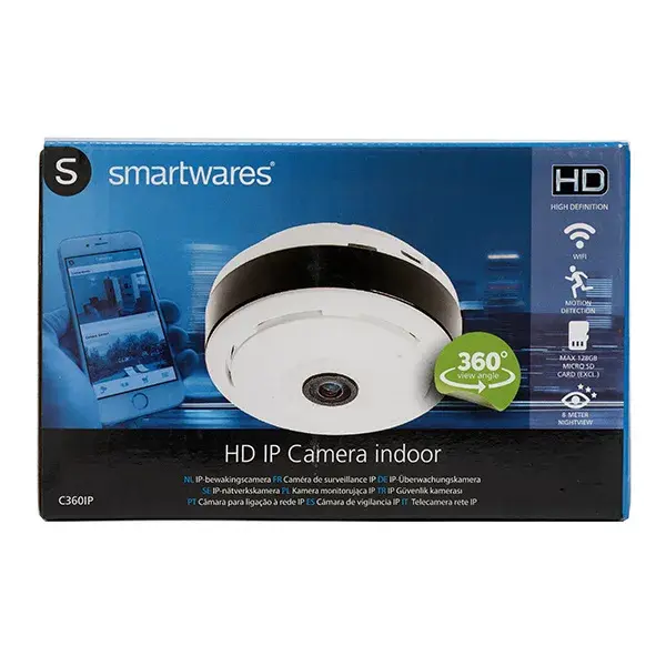 Cámara IP WIFI de interior con rerespuesta 720P HD y función pan/tilt (panorámica/inclinación) con un ángulo de 180 °. Puede ver imágenes en directo con su smartphone mediante una app gratuita. Grabación en tarjeta SD (Máx 128;no incluida).Especificaciones