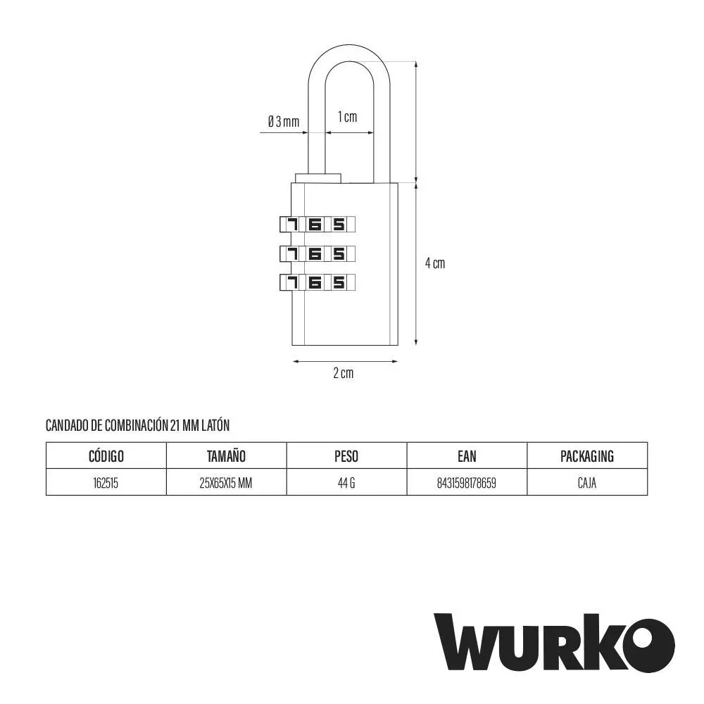 – candado de latón con arco de21mmcon combinación de 3 digitos, 3 ruedas graduablesdimensiones: 55x20mm.Especificaciones