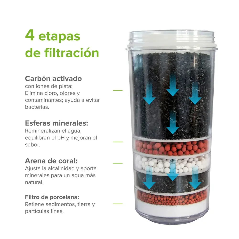 - Doble Función: No solo filtra, también remineraliza el agua y mejora el sabor con esferas minerales.