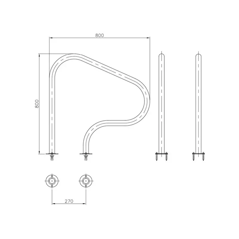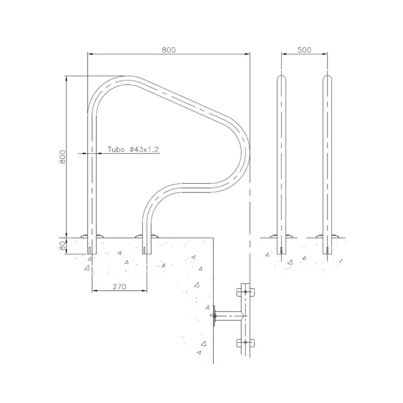 escalera para piscinas con rebosadero, que incorpora la curvatura con radio variable en el tramo de agarre dando un aspecto más reciente y atractivo.