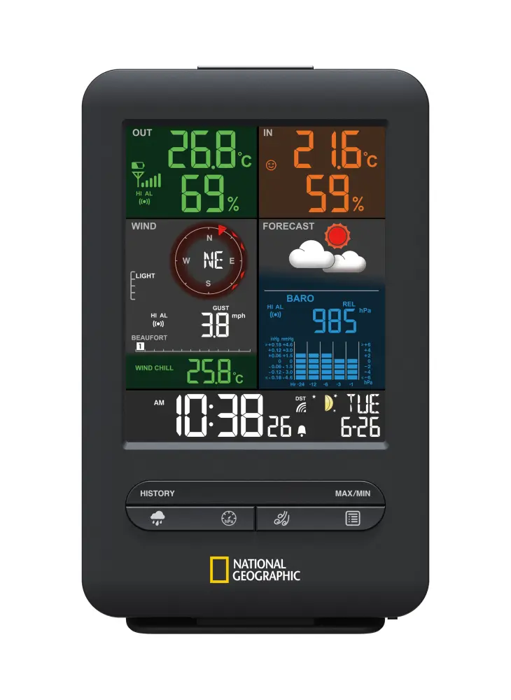 la estación meteorológica con pantalla en color de national geographic, en su nuevo diseño, impresiona por su excelente relación calidad-precio. El centro meteorológico combina un diseño compacto con un amplio servicio de información.