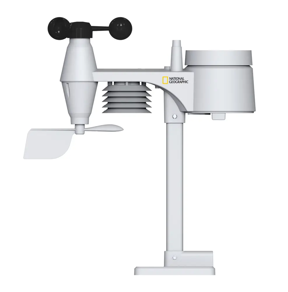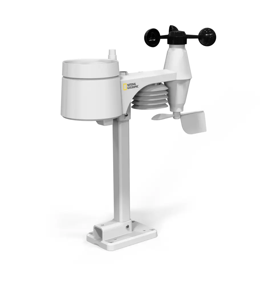 la nueva y exclusiva pantalla en color ofrece estructuras claras y un diseño noble. El sensor multifuncional, de diseño muy compacto, puede instalarse en casi cualquier lugar ahorrando espacio. El volumen de suministro incluye una abrazadera de tubo y tornillos para el montaje en mástiles (diámetro de tubo aprox. 25-33 mm), así como un soporte para el montaje a nivel. El sensor de exterior 5 en 1 transmite de forma fiable los valores medidos de velocidad y dirección del viento, humedad, temperatura y precipitaciones a la estación base. En la pantalla de la estación base no sólo se pueden leer estos valores, sino también una serie de datos históricos. Este último permite el almacenamiento interno y la evaluación de los datos de medición durante un período de 24 horas. A base de los datos recogidos, la estación meteorológica calcula una previsión meteorológica local muy fiable para las próximas 12 horas, que se muestra en la pantalla mediante seis símbolos gráficos. Se puede programar individualmente una alarma para los valores máximos y mínimos, que activa una señal acústica y luminosa cuando se alcanza el valor especificado. Además, se puede activar una alarma especial de aviso de helada/hielo para temperaturas exteriores desde -3°c. Para ello, la estación meteorológica de national geographic también ofrece una función inteligente. El indicador de clima interior siempre informa sobre el clima interior mediante un símbolo.