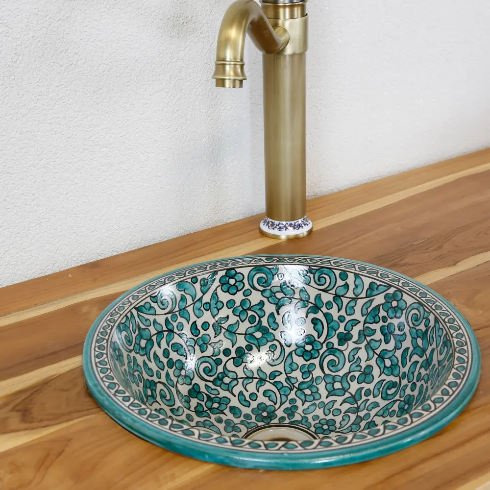 Lavabo de cerámica pintado a mano sin orificio para grifo: artesanía morisca de Fez