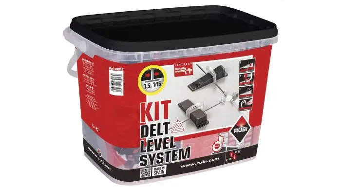 - El Kit DELTA LEVEL SYSTEM de RUBI se compone de: 1 tenaza DELTA LS, utilizable tanto en pavimentos como en revestimientos (colocación de baldosa cerámica horizontal y vertical); 1 bolsa de 100 unidades de bridas DELTA LS, para su uso en baldosas cerámicas de espesores comprendidos entre los 3 mm y los 12 mm, y 1 bolsa de 100 unidades de cuñas DELTA LS reutilizables.
