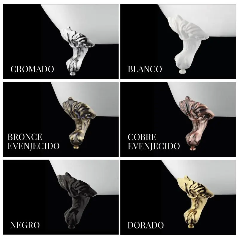 Patas de águila o de león en acabado: Cromado, Dorado, Blanco, Negro, Metallo conductor o Aleación metálica envejecido.