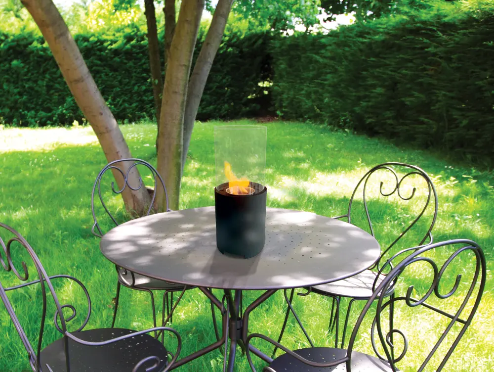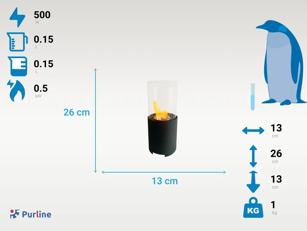 La chimenea AMPEROS es un modelo cilíndrico con una base en acero negro y un cuerpo en cristal templado que enmarca una bonita llama, quepuede producir hasta 500W de potencia calorífica.Especificaciones