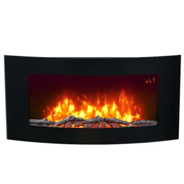 Su diseño es contemporáneo, con panel de cristal curvado en color negro brillo y en su interior efecto de leño y llamas con y sin calor.