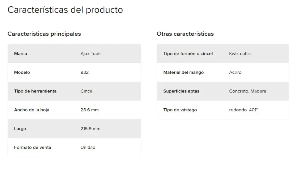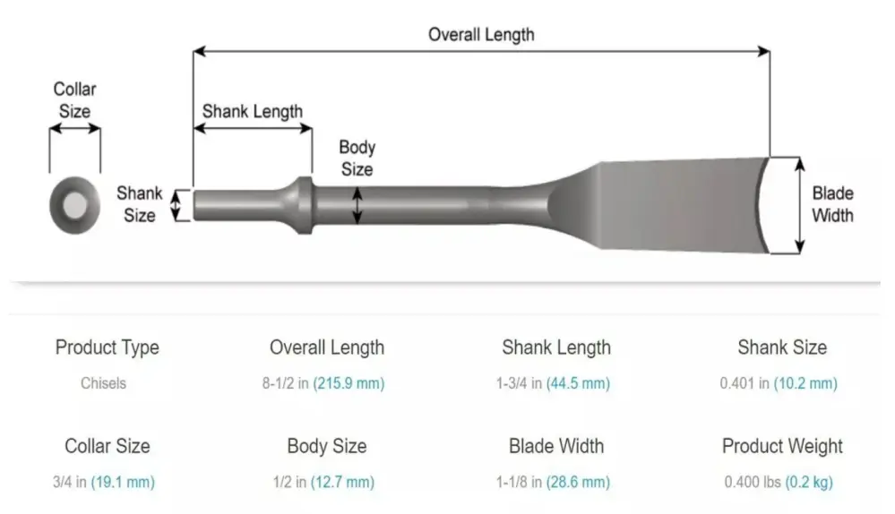 Su mango de 0,401 pulgadas (10,2 mm) garantiza compatibilidad con la mayoría de martillos y cinceladores neumáticos estándar. El cuello de 3/4 pulgadas (19,1 mm) y el cuerpo de 1/2 pulgada (12,7 mm) proporcionan rigidez estructural, mientras que la hoja de 1-1/8 pulgadas (28,6 mm) facilita cortes precisos, limpios y controlados.