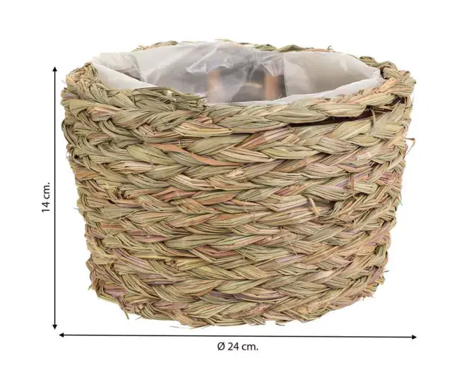 Cesta redonda de madera y esparto de 24x24x14 cm. Cesta redonda de madera y esparto forrada, la estructura de la cesta es de madera de paulownia y toda va cubierta por tiras de esparto trenzado, desde la base hasta la parte superior. El esparto es una fibra natural muy tipico de la zona mediterranea, nuestros antesapasados lo tejian haciendo cestas, alfombras, capazos, etc. Puedes colocar la cesta en tu salon, comedor, banyo o dormitorio y tener ordenados pequenyos objetos cotidianos. Un practico, decorativo y funcional set de cestas multiusos, el complemento ideal para reforzar tu decoracion y potenciar el mantenimiento del orden en tu hogar. Sus medidas y caracteristicas son:Largo: 24 cm. Elevado: 14 cm. Ancho: 24 cm. No requiere montaje Peso: 4 kgMaterialFibra vegetal