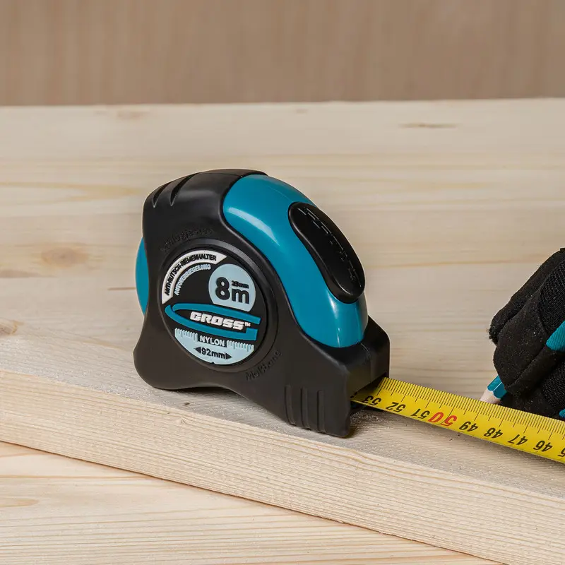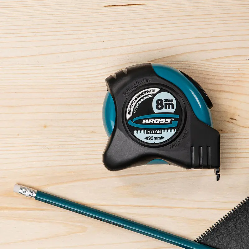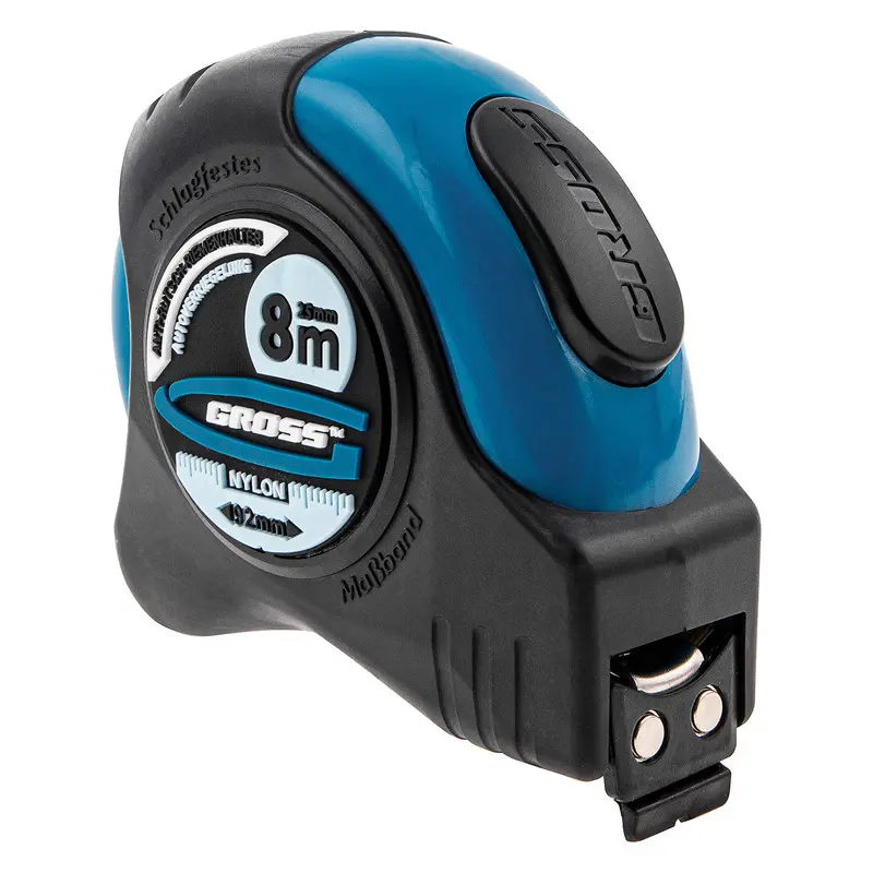 GROSS – Cinta métrica «Schlagfest» – 8 m x 25 mmCinta métrica de 8 m con cuerpo de goma, magnética, con doble escala y revestimiento de nailon. Práctica, precisa y resistente.¡Un compañero indispensable!La cinta métrica «Schlagfest» de GROSS permite medir longitudes de hasta 8 metros.Te será útil en todo tipo de obras: construcción, renovación, corte, etc. Te permitirá medir longitudes, superficies y más con precisión.Durable a prueba de todoEl diseño de la cinta métrica le permite resistir posibles golpes y caídas. La cinta está recubierta de nylon y protegida contra la corrosión para una mayor durabilidad.Gancho magnéticoSistema TrueZeroFuncionalLa cinta está equipada con un gancho magnético que facilita su uso.El gancho se mantendrá firmemente en una superficie metálica y te permitirá ejecutar todas tus mediciones sencillomente.El sistema TrueZero asegura la precisión del cero de la cinta métrica: la cinta está perfectamente calibrada y mide a partir de 0 cm.En caso de falta de preci