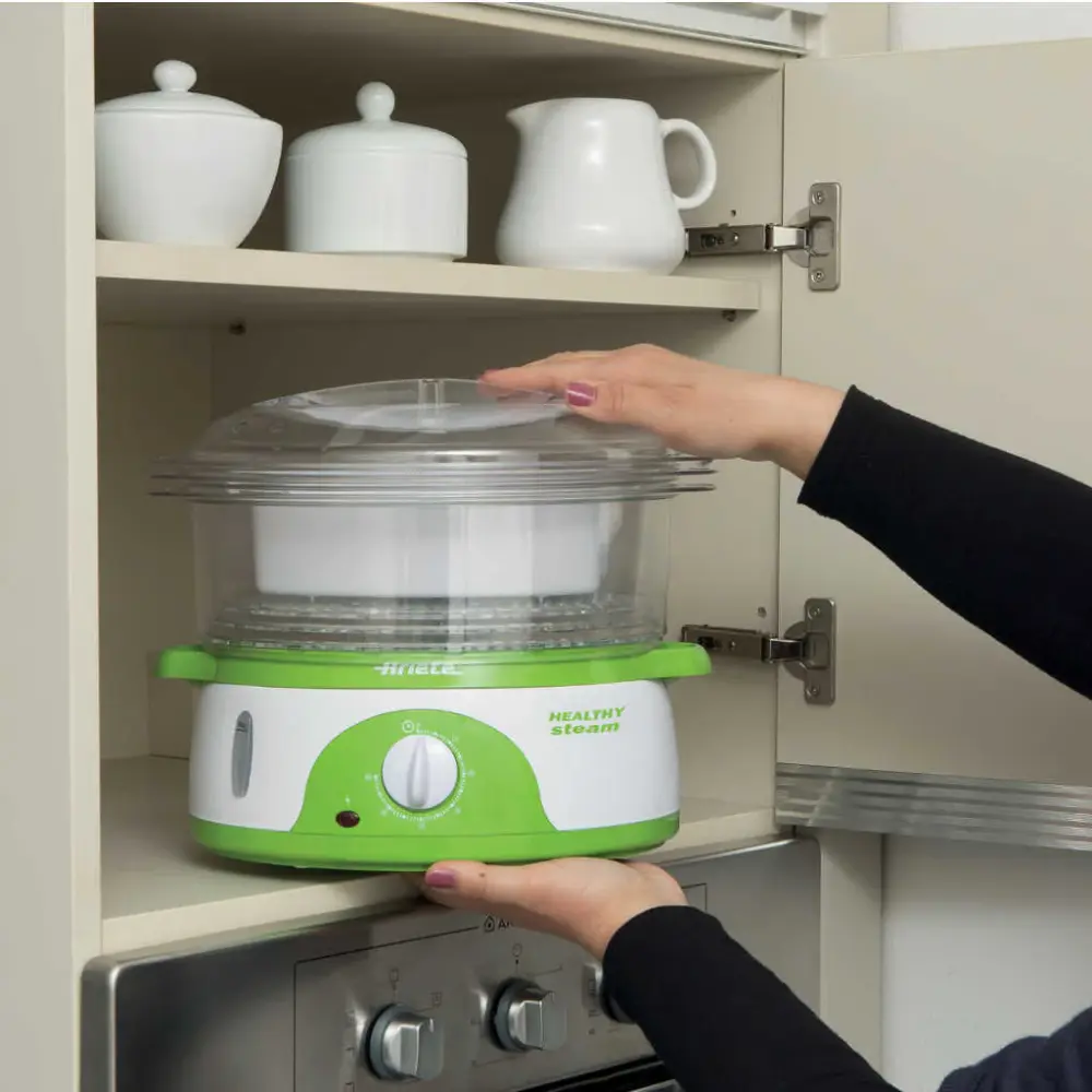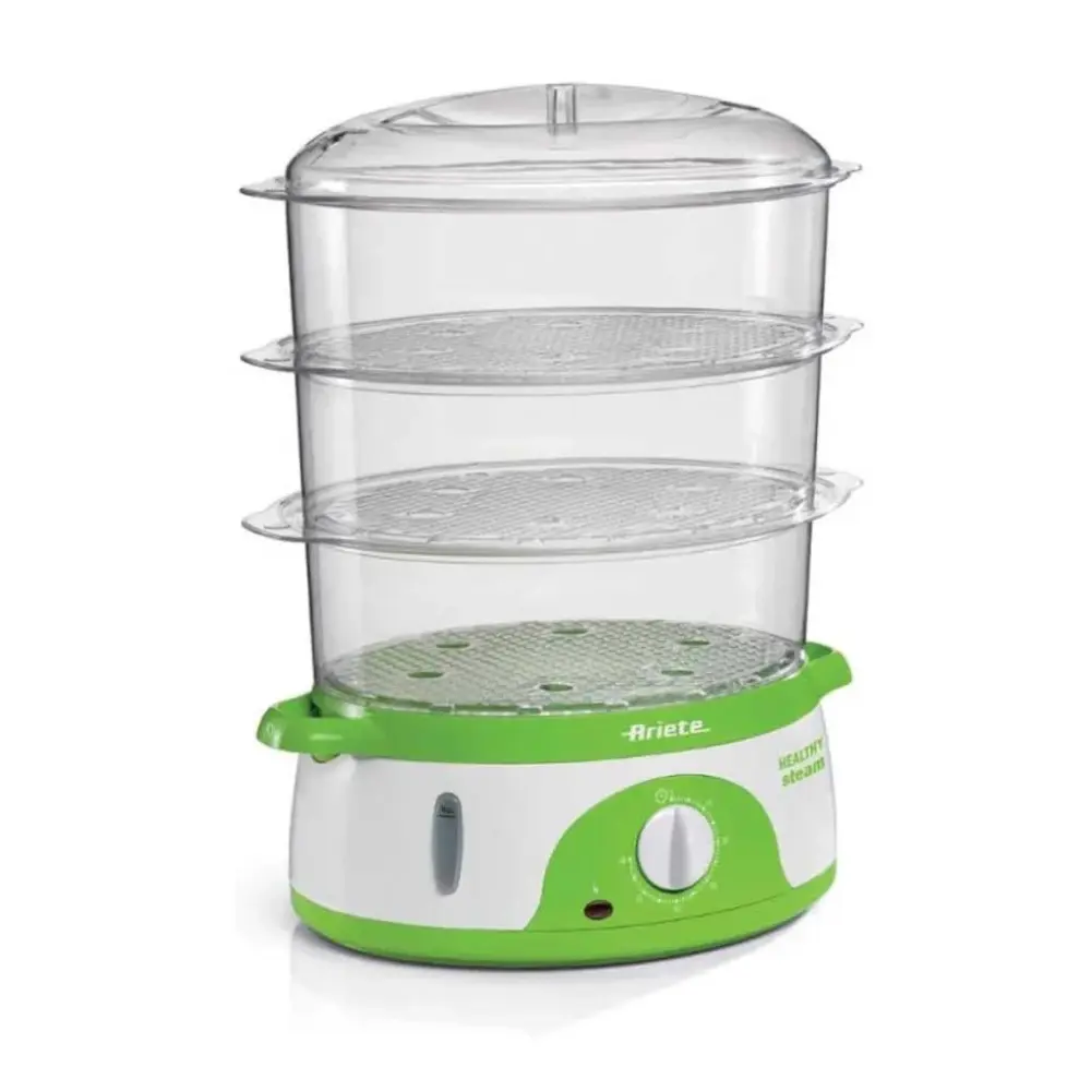Con su diseño en columna, el Cocedor a vapor de 3 pisos Ariete te permitirá cocinar al vapor hasta tres recetas diferentes, ocupando el mínimo espacio. Esta vaporera eléctrica tiene tres cestas independientes que te facilitarán la cocción de arroz, pescado, verduras, huevos, carnes e incluso frutas, manteniendo todo su sabor y sus nutrientes. Además, podrás ver en todo momento el interior, porque las cestas y la tapa son transparentes.