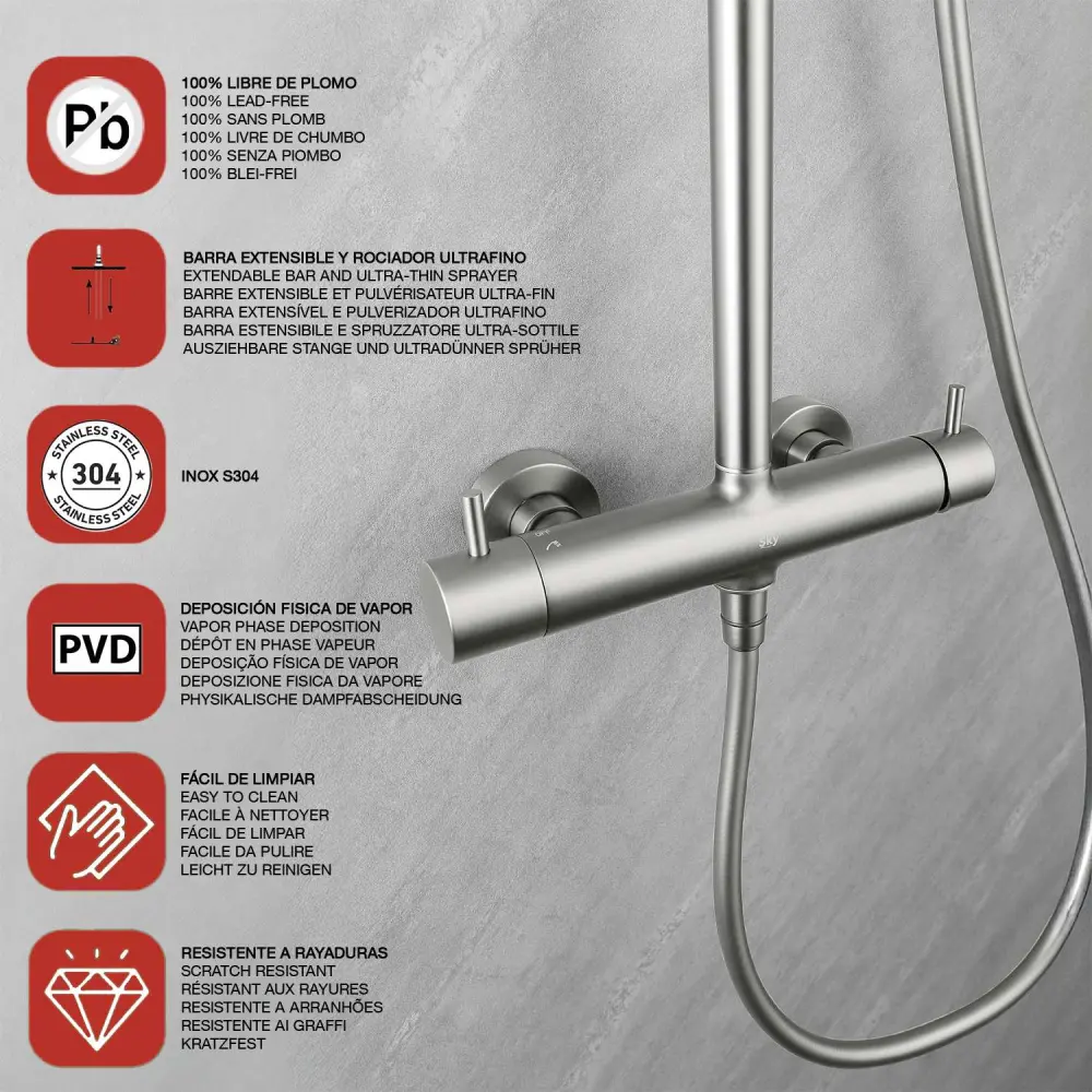 · Acabado: níquel cepillado · Inversor integrado · Rociador redondo de 25 cm de acero inoxidable S304; ultrafino y anticalcáreo · Mango de ducha redondo 3 funciones en ABS con soporte regulable y orientable · Flexo PVC de 1,5 m · Cartucho cerámico de Ø35 mm · Presión: entre 2 y 8 bares · Abarca flexos de 60 cm · Fácil de instalar · Seguridad: 10 años