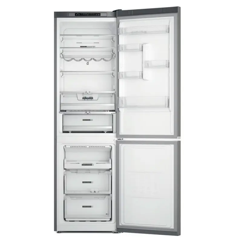 Whirlpool W7X 94A OX. Volumen neta total: 367 L. Bisagra para puerta: Derecho. Nivel de ruido: 33 dB. Frigorífico, capacidad neta: 263 L, Antiescarcha (nevera), Luz interior de la nevera, Frigorífico, número de compartimentos: 4, Número de compartimientos para verduras: 2. Congelador, capacidad neta: 104 L, Volumen de congelación: 11 kg/24h, Antiescarcha (congelador). Compartimiento de zona fresca. Clase de eficiencia de energía: C, Consumo de energía anual: 162 kWh. Tono del producto: Resistente corrosiónidable FICHA TÉCNICA: Tipo de instalación: IndependienteTono del producto: Resistente corrosiónidable Pantalla incorporada: Si Bisagra para puerta: Derecho Tipo de control: Tocar Ubicación de la pantalla: Uso interior Tela de estantes: Cristal Anti-huellas: Si Volumen neta total: 367 L Clase de emisión de ruido: B Nivel de ruido: 33 dB Temperatura mínima de operación: 10 °C Máxima temperatura: 43 °C Frigorífico, capacidad neta: 263 L Antiescarcha (nevera): Si Sistema multi-flujo de ai