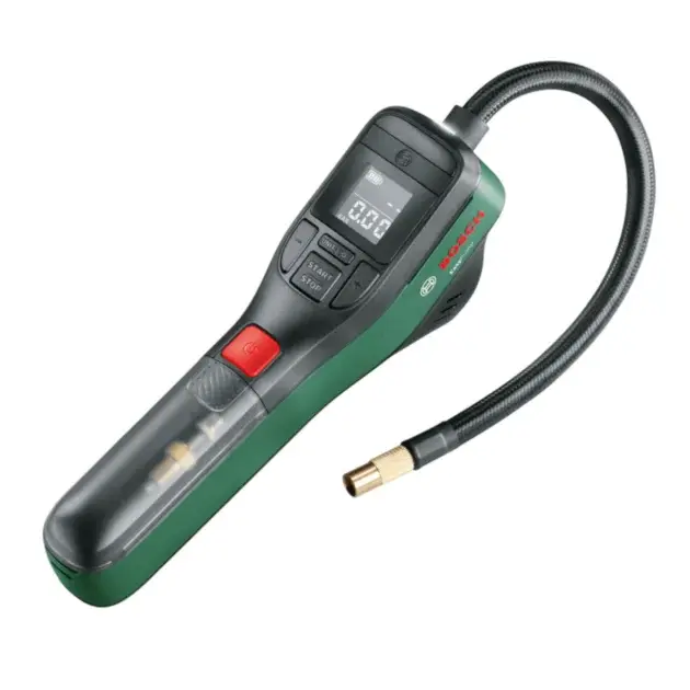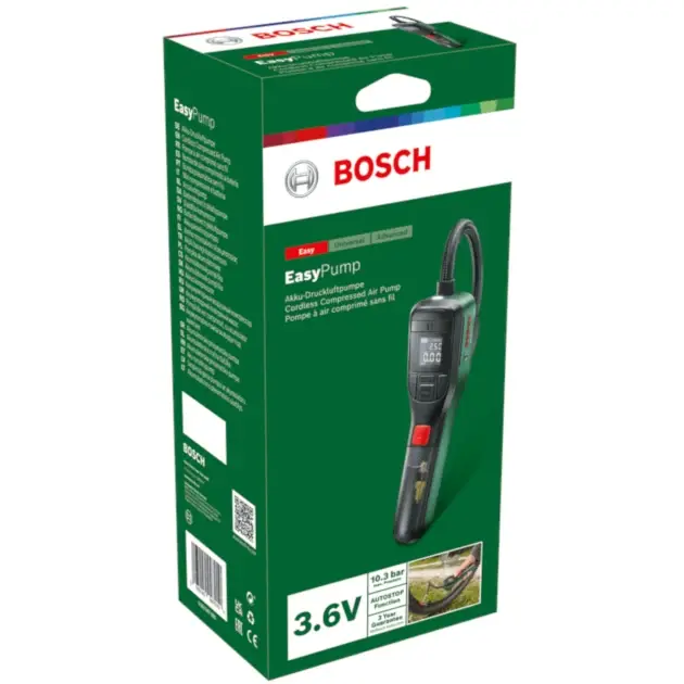 Compresor modelo EasyPump a batería con unas dimensiones de 265 x 123 x 87 mm. Volumen: 10 l/min; peso: 0,4 kg; Potencia: 150 Presión nominal; Presión máxima: 10,30 barEspecificaciones