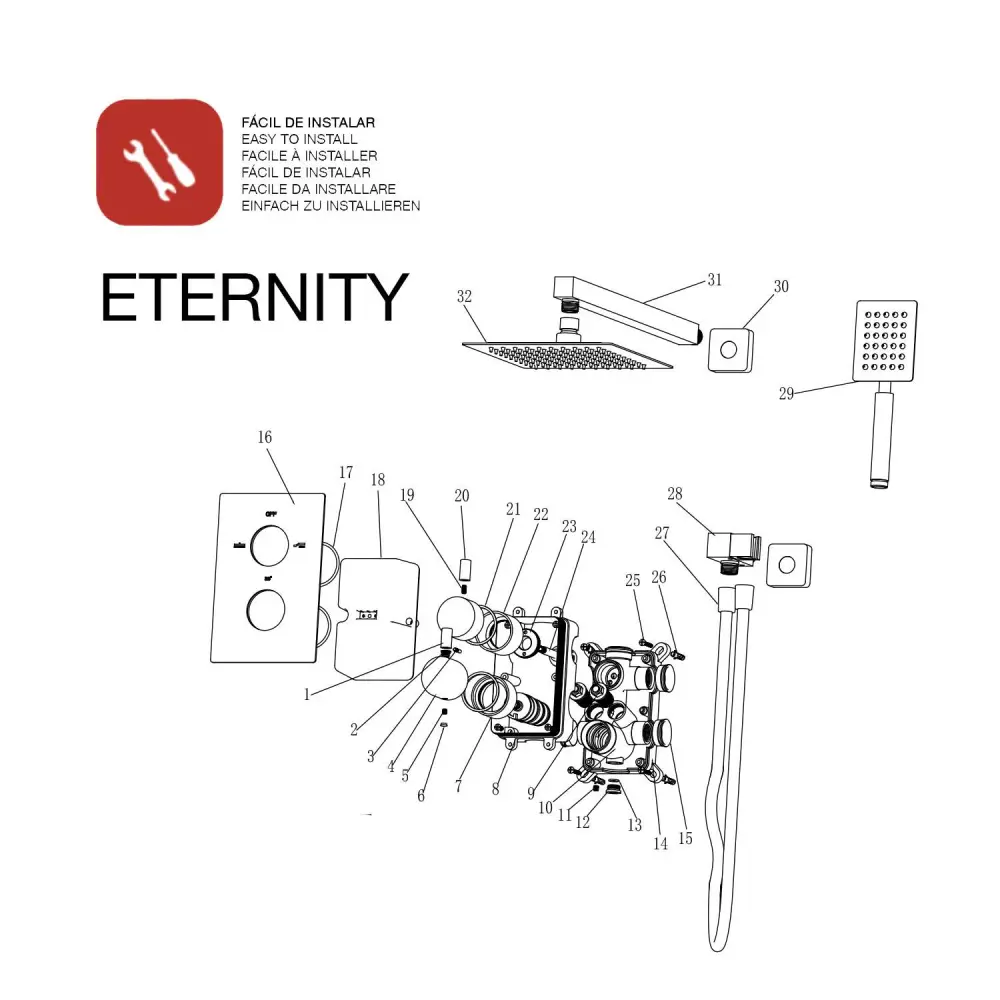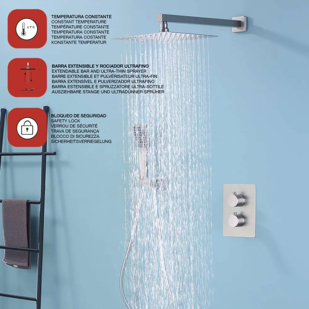 · Acabado: níquel cepillado · Ajuste preciso de la temperatura de salida y bloqueo de seguridad a 38°C · Rociador cuadrado de acero inoxidable S304 de 25 cm con acabado anticalcáreo montado en la pared · Mango de ducha cuadrada con soporte regulable y orientable à sortie murale · Flexo PVC de 1,5 m · Cartucho termostático VERNET (creado en Francia) · Seguridad: 10 años