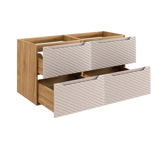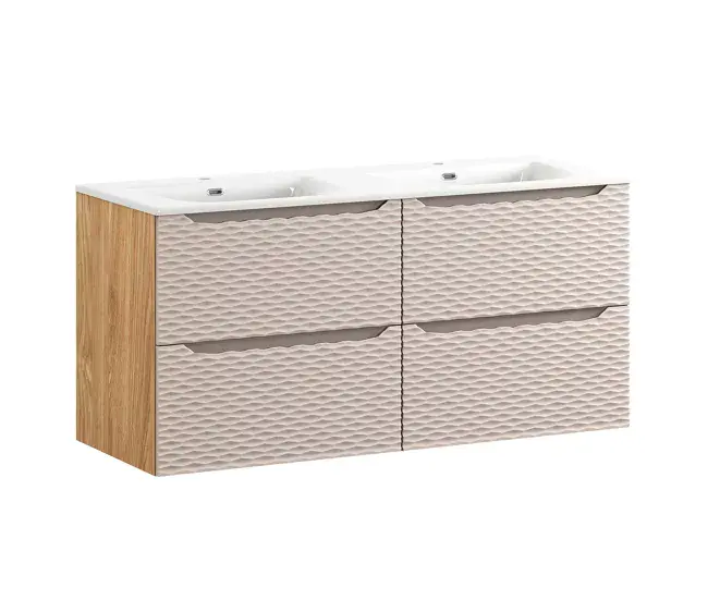 Conjunto de muebles con doble lavabo encastrado 120cm 4 cajones y columna Elora Beige y madera