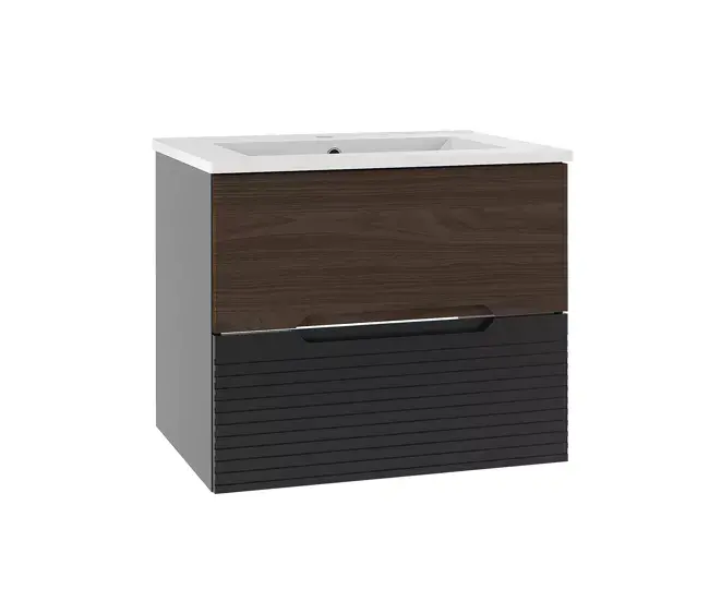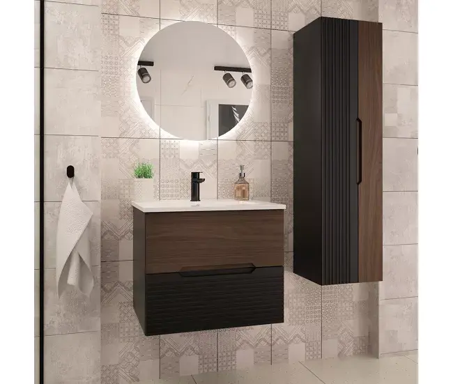 Conjunto de muebles con lavabo individual encastrado 60cm y columna Sylla Negro y madera