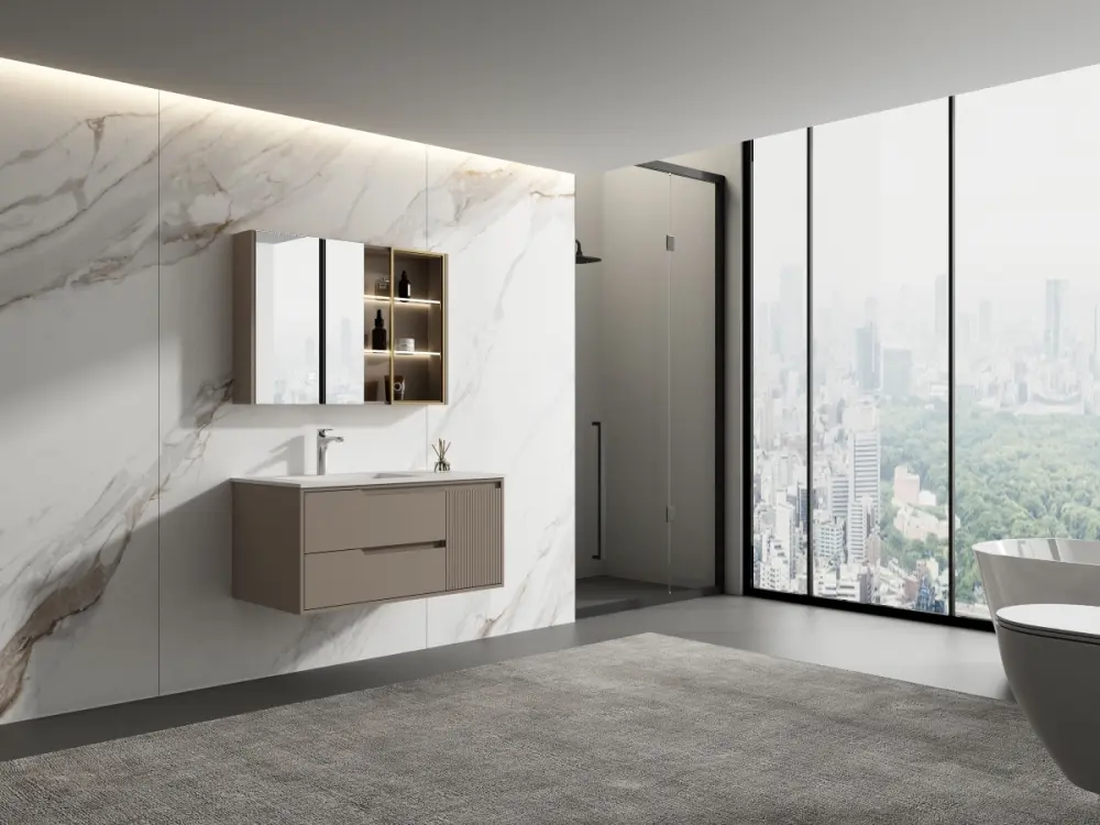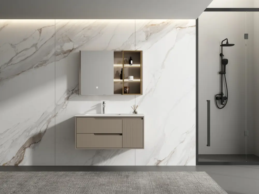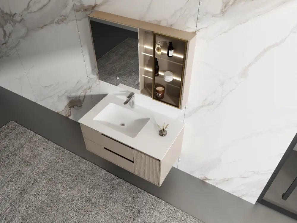Conjunto de mueble compuesto por armario colgante con una puerta y un cajón, lavabo y espejo. Tiene un mueble de madera contrachapada de 15 mm para el cuerpo y de madera maciza para la esquina redonda, con acabado melamínico para el cuerpo y la puerta, y acabado de pintura para la esquina redonda, en color Greige. El mueble dispone de dos cajones con cierre progresivo y puerta abatible. El lavabo, acabado en resina, se puede usar con un grifo monomando, que no está incluido. El conjunto se completa con un armario con espejo LED plateado de 4 mm que se acciona con un botón táctil. Adecuado para lucir una decoración funcional.Especificaciones