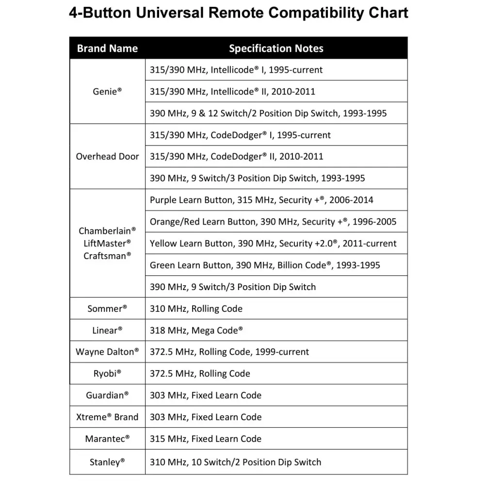 Este control remoto universal para abre-puertas de garaje es la última incorporación a una larga lista de innovaciones técnicas de Genie, la marca de confianza para abre-puertas de garaje. Compacto y práctico, este control remoto puede controlar hasta cuatro abre-puertas de garaje o receptores de portones de las marcas más populares. Sus ajustes preprogramados lo convierten en una opción sencilla y lista para usar para controlar múltiples abre-puertas. ¿Tiene varias marcas o generaciones de abre-puertas? ¡No hay problema! Todos los controles remotos universales Genie de 4 botones pueden operar con tecnologías de código variable e interruptores DIP en el mismo dispositivo. Programe fácilmente este control remoto con la distribución de botones que desee para cualquiera de las especificaciones de fabricantes compatibles. ¡Controlar hasta 4 abre-puertas o receptores de portones diferentes con un solo control remoto diminuto nunca ha sido tan fácil! Su diseño compacto, no más amplio que un