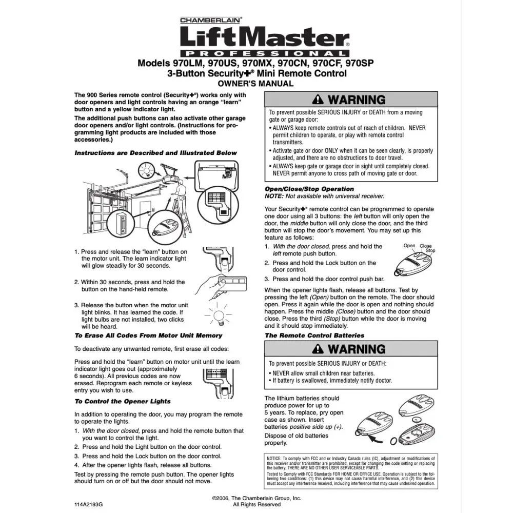 Minicontrol remoto de seguridad de 3 botones LIFTMASTER 970LM, 970US, 970MX, 970CN, 970CF, 970SP