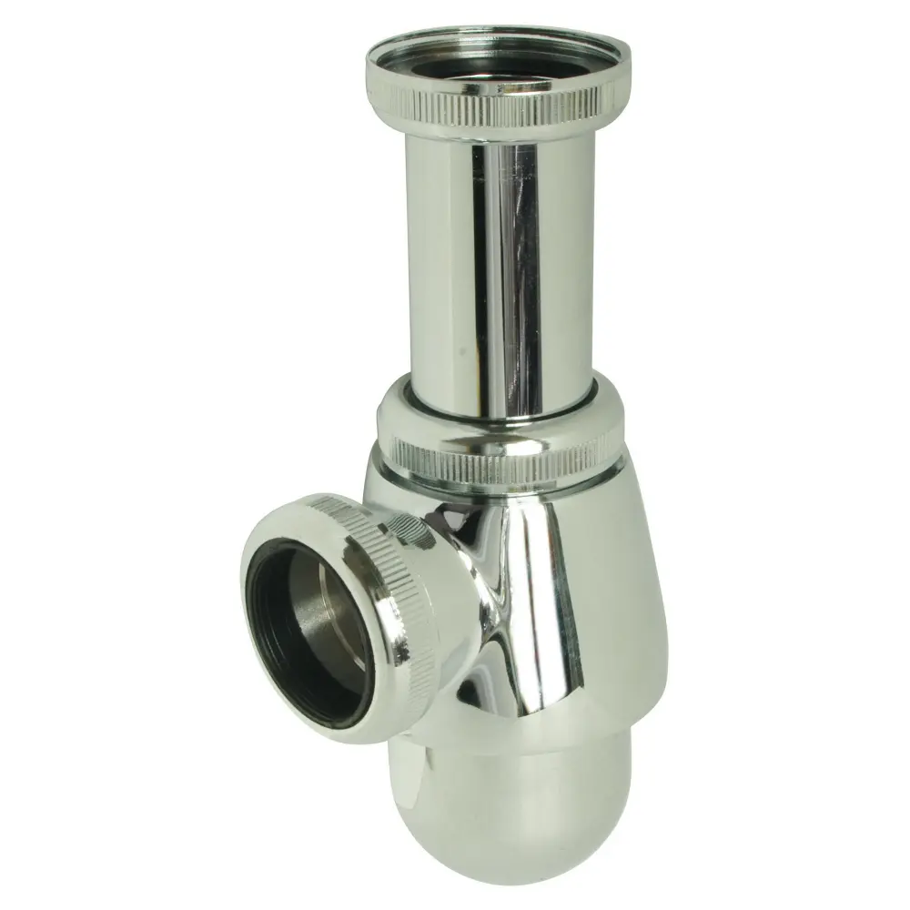 Sifón de lavabo o bidé de latón cromado – Evacuación Ø32 – Llegada tuerca prisionera 33/42 – salida tuerca 33/42 con junta americana para tubo de 32 – Capacidad líquido 42 l/min bajo 120 mm – Tamaño reducido